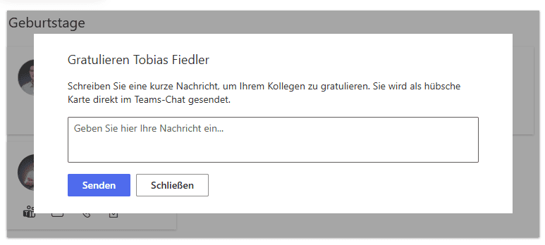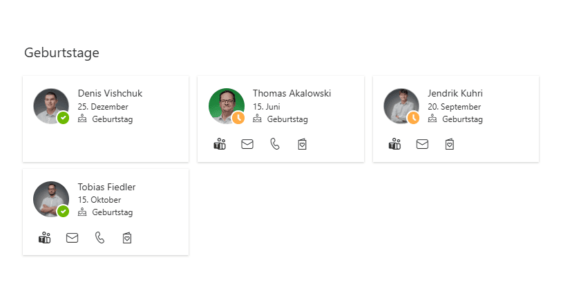 Unser Geburtstags-Webpart für SharePoint zeigt die bevorstehenden Geburtstage Ihrer Kolleginnen und Kollegen direkt im Microsoft 365-Intranet an. Sie können alle Geburtstage der nächsten 7 Tage einsehen – ideal, um Teamkultur zu stärken und persönliche Beziehungen innerhalb des Unternehmens zu fördern.