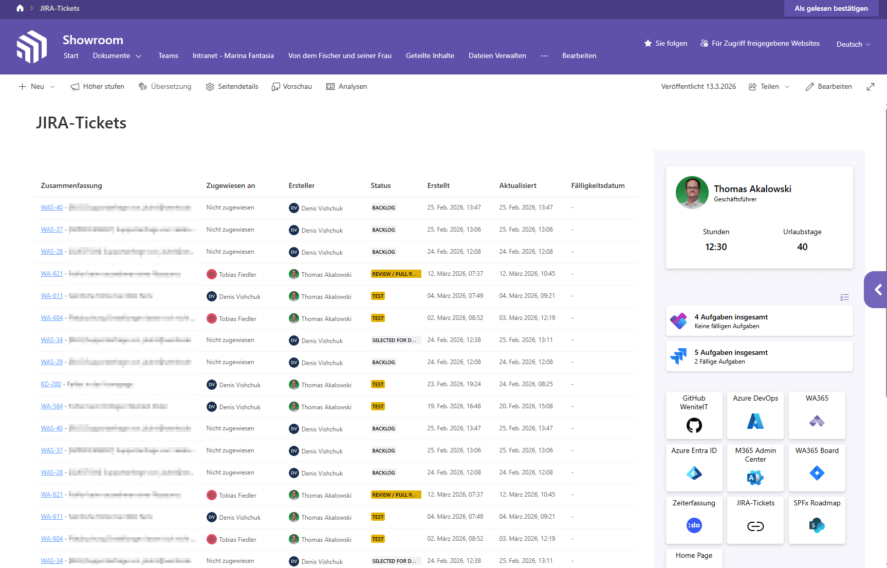 Dieser Webpart zeigt Jira-Tickets direkt in Ihrem Microsoft 365 SharePoint-Intranet an. Über das verbundene Dashboard können Benutzer Standardfilter aus Jira oder von Administratoren definierte Filter auswählen, um Aufgaben und Projekte gezielt zu verfolgen und den aktuellen Arbeitsstand jederzeit im Blick zu behalten.