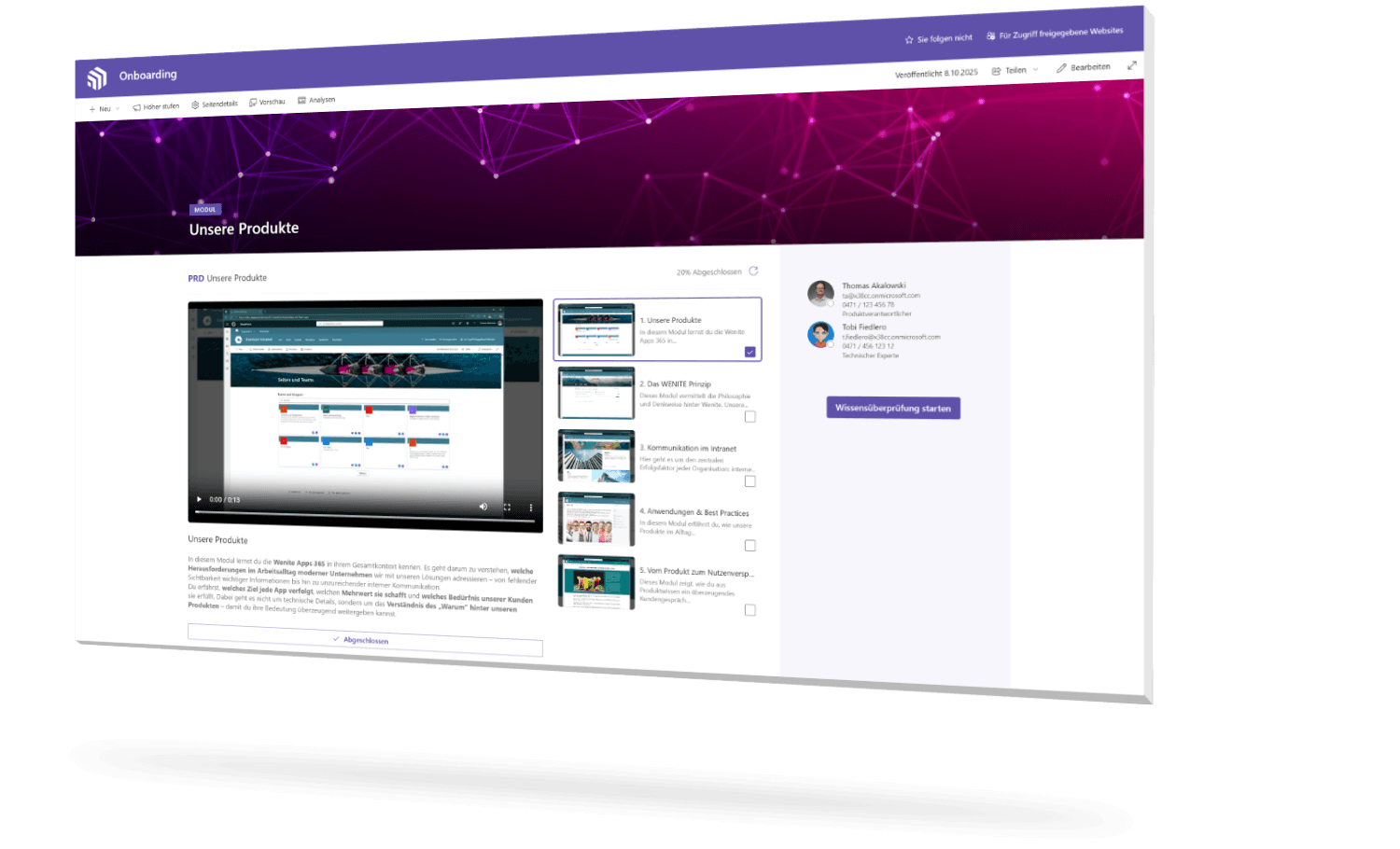 Erleben Sie in kurzen Videos, wie Sie Schulungsmodule erstellen, Prüfungen durchführen und Fortschritte analysieren. Sehen Sie, wie einfach sich neue Mitarbeiter strukturiert einarbeiten lassen – direkt in SharePoint und ohne zusätzliche externe Systeme.