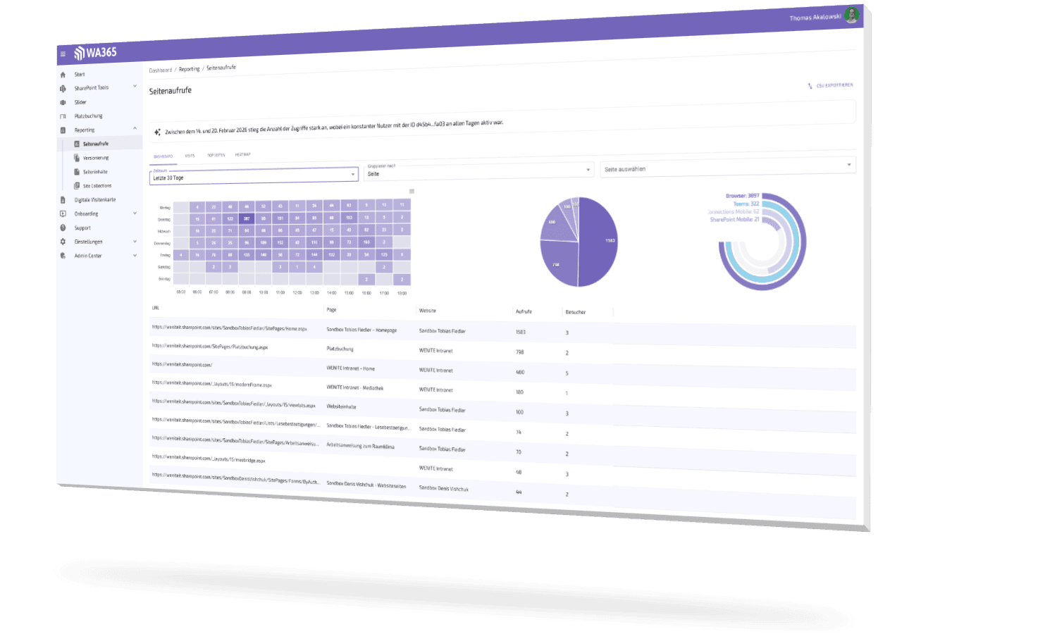 Behalten Sie alle Aktivitäten, Entwicklungen und Optimierungspotenziale Ihrer SharePoint-Umgebung stets im Blick. Vollständig integriert in Microsoft 365, automatisch im Hintergrund analysiert und übersichtlich im Dashboard visualisiert.